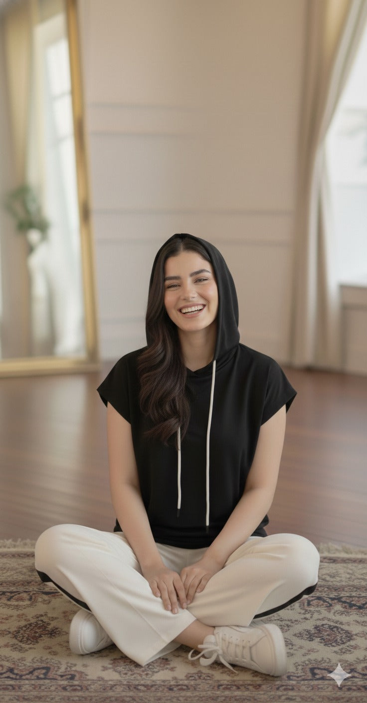 Stay cozy and stylish with this charcoal hoodie featuring playful sleeveless and ultra-comfy cross weave stretch terry fabric. Perfect for layering or lounging, it offers just the right amount of stretch and softness, making every move feel effortless and fun!
